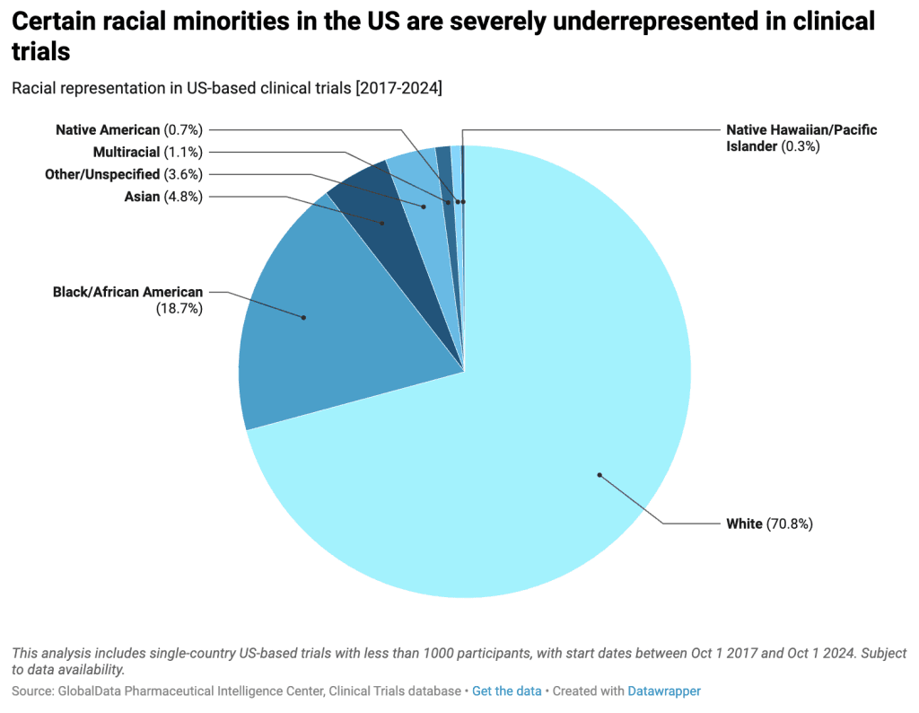 GlobalData’s Clinical Trials database reveals that 18.7% of clinical trial participants in US-based studies identified themselves as Black/African American between 2017 and 2024. However, representation amongst other racial minorities such as Native American (0.7%), Native Hawaiian/Pacific Islander (0.3%), and Asian (4.8%) has been very low. This analysis was restricted to studies where the diversity data was available. As such, underrepresentation could be more extreme since only around 38% of North American trials disclose participants’ racial data.