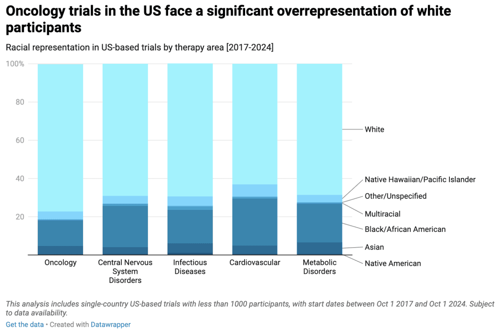 Moreover, examining the data by five key therapy areas, it is clear that a lack of diversity continues to plague US oncology trials, where 77% of participants enrolled in studies from 2017-2024 identified as White.