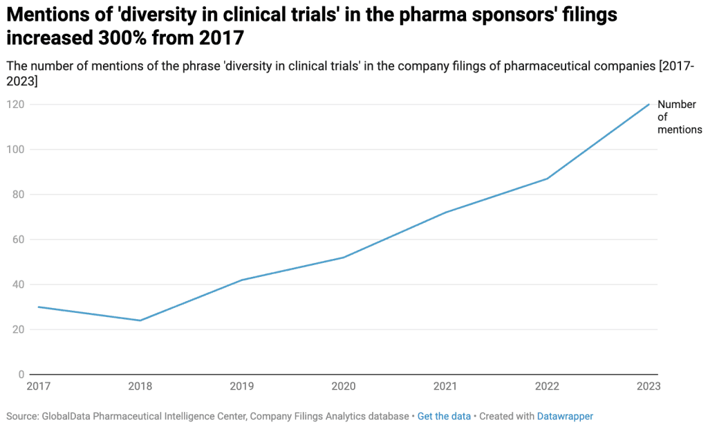 While the figures indicate a lot of work must be done to improve minority representation in clinical research, the industry is increasingly focused on addressing this. In fact, since 2017, the number of times pharmaceutical sponsors have mentioned the phrase ‘diversity in clinical trials’ in their company filings has increased by 300%, reflecting increasing awareness of the problem and a growing commitment to improving it. This trend has been particularly strong in the states, with US-headquartered companies accounting for 69% of mentions in 2023.